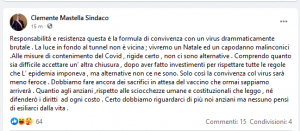 “Responsabilità e resistenza questa è la formula di convivenza con un virus drammaticamente brutale . La luce in fondo al tunnel non è vicina ; vivremo un Natale ed un capodanno malinconici .Alle misure di contenimento del Covid , rigide certo , non ci sono alternative . Comprendo quanto sia difficile accettare un’ altra chiusura , dopo aver fatto investimenti per rispettare tutte le regole che L’ epidemia imponeva , ma alternative non ce ne sono. Solo così la convivenza col virus sarà meno feroce . Dobbiamo fare ancora dei sacrifici in attesa del vaccino che ormai sappiamo arriverà . Quanto agli anziani ,rispetto alle sciocchezze umane e costituzionali che leggo , ne difenderò i diritti ad ogni costo . Certo dobbiamo riguardarci di più noi anziani ma nessuno pensi di esiliarci dalla vita .”Cosi il sindaco Mastella su Facebook