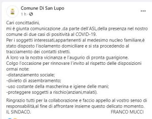Sono sempre meno i comuni sanniti “Covid Free”. Anche nel piccolo comune di San Lupo si sono registrati i primi due casi di positività. Ad annunciarlo il sindaco Franco Mucci. Fino ad oggi a San Lupo non si contava nessun caso positivo