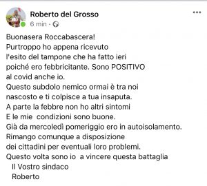 È risultato positivo il sindaco di Roccabascerana, Roberto Del Grosso. Ad annunciarlo stesso il primo cittadino attraverso un post su Facebook. Si tratta della seconda positività odierna che riguarda una fascia tricolore irpina. In mattinata la notizia della positività di Marcello Arminio, sindaco di Bisaccia