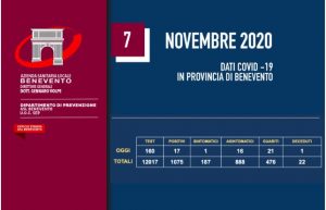 Sono 17 su un totale di 160 tamponi i nuovi contagni nel Sannio. E’ quanto riporta il bollettino odierno dell’Asl di Benevento. Si registrano più guarioni che casi: 21 le persone che hanno sconfitto il virus, per un totale di 476 guariti dal primo caso. Sono invece 1075 gli attuali positivi. Purtroppo anche oggi si è registrato un decesso, un anziano di Airola. Dall’inizio della seconda ondata le vittime sannite da Covid-19 sono 22