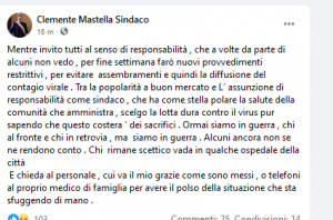 ‘Mentre invito tutti al senso di responsabilità , che a volte da parte di alcuni non vedo , per fine settimana farò nuovi provvedimenti restrittivi , per evitare assembramenti e quindi la diffusione del contagio virale . Tra la popolarità a buon mercato e L’ assunzione di responsabilità come sindaco , che ha come stella polare la salute della comunità che amministra , scelgo la lotta dura contro il virus pur sapendo che questo costera ‘ dei sacrifici . Ormai siamo in guerra , chi al fronte e chi in retrovia , ma siamo in guerra. Alcuni ancora non se ne rendono conto . Chi rimane scettico vada in qualche ospedale della città E chieda al personale , cui va il mio grazie come sono messi , o telefoni al proprio medico di famiglia per avere il polso della situazione che sta sfuggendo di mano.’. Cosi il sindaco Mastella su Facebook.