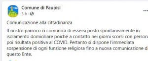 Parroco in isolamento domiciliare e sospensioni regioliose sospese a Paupisi. E’ quanto comunica il sindaco del comune sannita Antonio Coletta sulla pagina facebook dell’ente