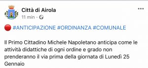 Ad Airola la scuola in presenza non riprenderà il prossimo 11 gennaio. Lo ha stabilito il sindaco Michele Napoletano che su Facebook ha anticipato i contenuti di un’ordinanza che sarà pubblicata nelle prossime ore:le attività didattiche ogni ordine e grandi non prenderanno l via prima della giornata Lunedì 25 gennaio