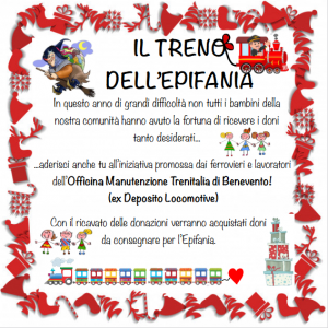 50 giocattoli e 40 calze della Befana per circa 50 bambini bisognosi della citta’ di Benevento. E’ l’iniziativa dal titolo’ Il treno dell’Epifania’ messa in campo dai ferrovieri e lavoratori dell’Officina Manutenzione Trenitalia di Benevento. Pacchi regalo nelle mani di Caritas e della Parrocchia Santa Maria di Costantinopoli del Rione Ferrovia da tempo a contatto con chi ha bisogno. Un gesto d’amore in tempi di covid e difficolta’ economiche.