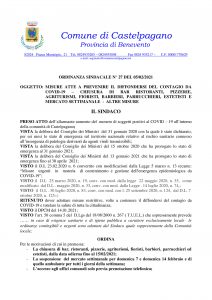 A seguito dell’allarmante aumento dei contagi (32) da Covid-19 nel comune di Castelpagano, nel Sannio, il sindaco Giuseppe Bozzuto ha firmato un’ordinanza che prevede una serie di misure restrittive volte a contenere la diffusione del contagio. Fino al 15 febbraio chiusi bar, ristoranti, pizzerie, agriturismi, fioristi, barbieri, parrucchieri e estetisti; sospesi i mercati settimanali del 7 e 14 febbraio. Inoltre l’accesso agli uffici comunali potrà avvenire solo previa prenotazione telefonica. Per i prossimi giorni sarà assolutamente vietato soffermarsi nelle aree quali piazze, larghi e parchi pubblici. Infine presso ogni attività commerciale è consentito l’ingresso di una sola unità per nucleo familiare e per il tempo strettamente necessario agli acquisti essenziali nel pieno rispetto dei protocolli sanitari. Ribadito il divieto di qualsiasi forma di aggreggazione non necessaria e comunque il rispetto delle misure anti-contagio.