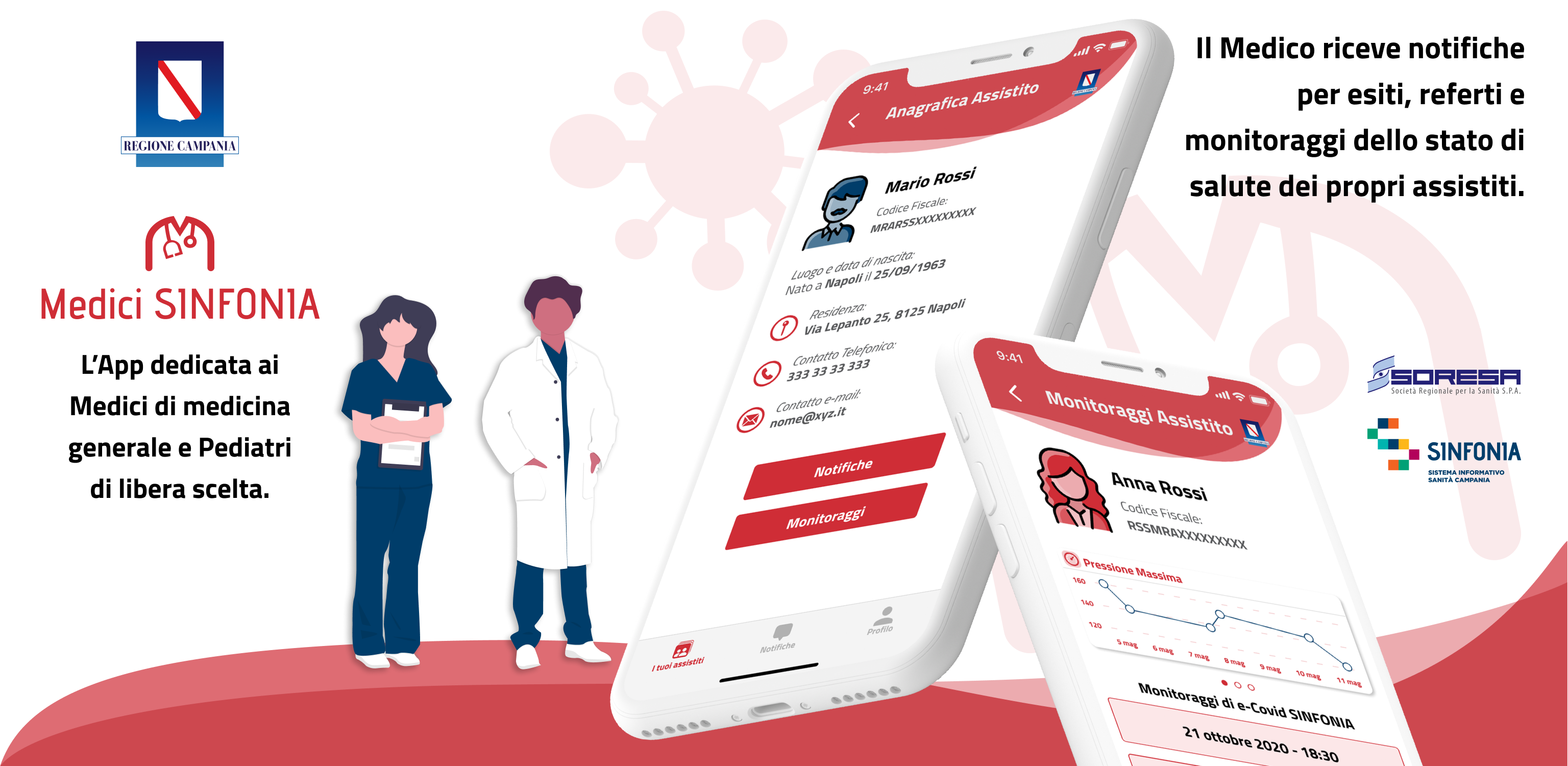 La Regione Campania ha reso disponibile l’App Medici SINFONIA dedicata ai medici di medicina generale (MMG) e ai pediatri di libera scelta (PLS), grazie alla quale sarà possibile supportare i propri assistiti. La nuova App realizzata da Soresa SpA permetterà ai medici di ricercare il proprio assistito per nome e cognome o per codice fiscale e consultare i sintomi che gli assistiti hanno registrato sull’App e-Covid SINFONIA. Grazie ad un sistema di notifiche, il medico riceverà un messaggio ogni volta che diventa disponibile l’esito di un tampone per il proprio assistito e sarà possibile visualizzarlo, scaricare il referto e inviarlo rapidamente all’assistito. Inoltre, sarà possibile visualizzare lo storico dei test e tamponi registrati sui propri assistiti nella piattaforma regionale SINFONIA. L’App è riservata a tutti i Medici di medicina generale e Pediatri di libera scelta nel territorio della Campania, nel tempo l’App sarà arricchita di nuovi servizi a valore aggiunto per interagire con l’ecosistema digitale SINFONIA. Per accedere è necessario essere in possesso delle credenziali di accesso alla piattaforma regionale SINFONIA (Anagrafe Unica oppure e-Covid Sorveglianza). L’App Medici SINFONIA è un servizio che si affianca a quello di monitoraggio dell’App e-Covid SINFONIA attivato dalla Regione Campania, che consente a tutti i cittadini campani di inviare informazioni sullo stato di salute (anche per i propri familiari), visualizzare gli esiti di test e tamponi, prenotare il tampone antigenico per lo screening Scuola, il tutto direttamente dal proprio smartphone.