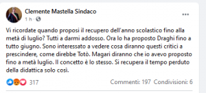 “Vi ricordate quando proposi il recupero dell’anno scolastico fino alla metà di luglio? Tutti a darmi addosso. Ora lo ha proposto Draghi fino a tutto giugno. Sono interessato a vedere cosa diranno questi critici a prescindere, come direbbe Totò. Magari diranno che io avevo proposto fino a metà luglio. Il concetto è lo stesso. Si recupera il tempo perduto della didattica solo così.” Cosi il sindaco Mastella su Facebook