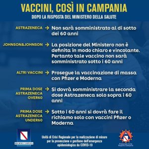 Astrazeneca al di sotto dei 60 anni; rispetto al vaccino Johnson&Johnson la posizione del Ministero non è definita in modo chiaro e vincolante, pertanto tale vaccino non sarà somministrato sotto i 60 anni; prosegue la vaccinazione di massa con Pfizer e Moderna; a chi ha fatto la prima dose di Astrazeneca si dovrà somministrare la seconda dose Astrazeneca solo sopra i 60 anni; sotto i 60 anni si dovrà fare il richiamo solo con vaccini Pfizer o Moderna”.
