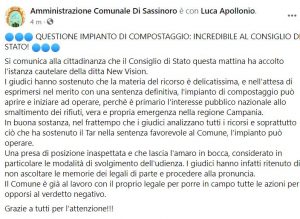 Doccia fredda a Sassinoro: il Consiglio di Stato, in via cautelativa e in attesa di pronunciarsi nel merito , ha autorizzato la ripresa delle attività dell’impianto di compostaggio da parte della New Vision. Una vicenda che ha sollevato tante polemiche nella cittadina dell’Alto Sannio coinvolgendo anche la Provincia di Benevento. A darne notizia è la pagina facebook del Comune di Sassinoro. L’impianto – si legge nel post – può aprire e iniziare ad operare perchè è primario l’interesse pubblico nazionale allo smaltimento dei rifiuti