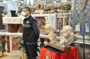 Per Guardia Sanframondi oggi è una giornata speciale,perchè si riappropria di pezzi unici di arte sacra, molti cari alla comunità. Recuperati quattro “preziosi angeli” in marmo trafugati da due chiese di Guardia Sanframondi, e restituiti grazie al vice comandante dei Carabinieri per la Tutela del Patrimonio Culturale (Tpc), colonnello Danilo Ottaviani, al parroco don Giustino di Santo presso la Chiesa di San Sebastiano. La cerimonia di consegna si è svolta alla presenza del vescovo di Cerreto Sannita – Telese – Sant’Agata de’ Goti, monsignore Giuseppe Mazzarafo, e del sindaco di Guardia Sanframondi Raffaele DI Lonardo. In particolare, sono stati riconsegnati due angeli da capo altare in marmo bianco, con decorazioni a drappo di foglie e frutta, opera di