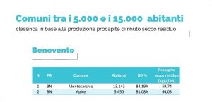 Apice si aggiudica il secondo posto dei “comuni free” tra 5000 e 15000 abitanti, ottenuto grazie ad una buona raccolta differenziata che riduce a 64kg la quantità di rifiuti indifferenziati annui per abitante. Tutto il merito ai cittadini apicesi, che si impegnano quotidianamente, al gestore del servizio di raccolta e all’Ente che, con le numerose campagne di sensibilizzazione e la continua comunicazione con i cittadini, favorisce il perseguimento degli obiettivi di