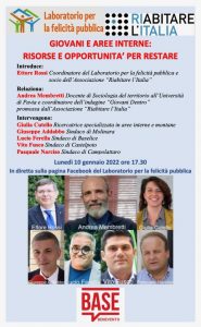 Il Laboratorio per la felicità pubblica e l’Associazione Riabitare l’Italia, in collaborazione con BASE Benevento, promuovono per il prossimo 10 gennaio alle ore 17.30 una videoconferenza sul tema: “Giovani e aree interne: risorse e opportunità per restare”.Ad introdurre i lavori sarà Ettore Rossi, coordinatore del Laboratorio per la felicità pubblica e socio dell’Associazione Riabitare l’Italia. Relazionerà Andrea Membretti docente di Sociologia del territorio all’Università di Pavia e coordinatore dell’indagine nazionale “Giovani Dentro” promossa dall’Associazione Riabitare l’Italia. Seguiranno gli interventi di: Giulia Cutello Ricercatrice specializzata in aree interne e montane, Giuseppe Addabbo Sindaco di Molinara, Lucio Ferella Sindaco di Baselice, Vito Fusco Sindaco di Castelpoto, Pasquale Narciso Sindaco di Campolattaro. L’appuntamento sarà l’occasione per approfondire, sulla base dei risultati della ricerca, le aspirazioni di buona vita, bisogni e gli orientamenti dei giovani italiani che vivono nelle aree interne. Coinvolgendo nel confronto alcuni sindaci di piccoli comuni del Sannio si intende avviare una riflessione su quali strategie e iniziative progettare e realizzare per consentire ai giovani di restare in questi luoghi. La videoconferenza sarà trasmessa in diretta streaming sulla pagina Facebook del Laboratorio per la Felicità pubblica.