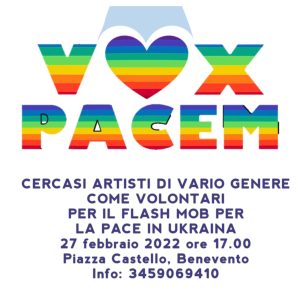Domenica pomeriggio alle 17.00 in Piazza Castello a Benevento è in programma un nuovo Flash mob per la pace in Ucraina. L’evento è organizzato dall’Associazione Orbisophia con la direttrice del Coro, la Soprano Tatyana Shyshniak. “Cerchiamo artisti di vario genere come volontari per il Flash mob Vox Pacem”- afferma Tatyana, per far sentire il nostro dissenso alle crudeltà della guerra in Ucraina.