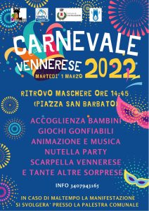 Il programma prevede il ritrovo della maschere nella centrale Piazza San Barbato (ore 14,45) dove ci sarà l’accoglienza dei bambini che potranno divertirsi con i giochi gonfiabili e con l’animazione e la musica. Gli stessi bambini potranno partecipare anche al “Nutella Party” e degustare la “scarpella vennerese”.