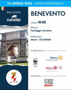 Anche Benevento partecipa alla giornata dedicata al “Plastic Free”: un appuntamento con l’obiettivo di rimuovere rifiuti, in particolare di plastica, dal nostro territorio. L’evento si inquadra nella Quarta Edizione del Cleanup Nazionale Plastic Free con ben 310 appuntamenti in tutto il territorio italiano. A Benevento è organizzato dall’assessorato all’Ambiente del Comune assieme al WWF Sannio, al Rotary Club di Benevento e al Rotaract Distretto 2101. Appuntamento alle 10 presso il parcheggio del Carrefour: i volontari dovranno essere muniti di guanti da giardinaggio o di pinza telescopica, seguendo le indicazioni dei referenti. L’obiettivo è ridurre l’impatto ormai pesantissimo delle plastiche sul nostro ecosistema: ogni anno 12 milioni di tonnellate di plastica raggiungono i mari di tutto il mondo, l’equivalente di un camion di rifiuti ogni minuto, e un milione e mezzo di animali, prevalentemente marini, muoiono a causa della plastica. L’inquinamento da plastica è ormai un problema che non possiamo più ignorare