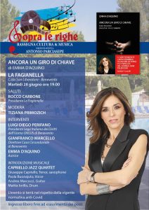 Oggi con il cambio di management confermiamo conclusa definitivamente l’esperienza collaborativa con il Conservatorio “Nicola Sala” e preferiamo volgere lo sguardo ad altri orizzonti. La Rassegna “Sopra le righe” continuerà ad offrire la propria programmazione alla città di Benevento, avendo come nuovo partnership il Circolo de “La Fagianella” che ringraziamo in uno con il presidente Rocco Carbone per l’organizzazione offerta e la Fondazione Ciccio Romano, per la rinnovata fiducia dei prossimi appuntamenti; a partire da quello della notte di San Giovanni in programma il prossimo 23 giugno e quello del 24 per la presentazione del libro “L’uomo Cervo”. A seguire ci sarà l’atteso incontro con la giornalista della redazione del TG di RAI1, Emma D’Aquino per il libro “Ancora un giro di chiave” che si terrà il prossimo 28 giugno a partire dalle ore 19,00 nella splendida cornice de “La Fagianella” con la partecipazione di illustri ospiti e la fresca introduzione musicale del “Capriello Jazz quartet” con Giuseppe Capriello Tenor saxophone, Paola Buonajuto Voice, Andrea Marcocci Guitar, Mattia Iorillo Drum.