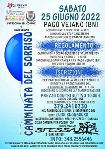 E’ in programma domani, sabato 25 giugno, a Pago Veiano la Passeggiata del sorriso manifestazione benefica organizzata da «Io non mollo – Stop Cancer Aps», associazione impegnata in attività di promozione sociale a sostegno dei malati oncologici e della ricerca sul cancro. Un’iniziativa il cui ricavato sarà destinato all’acquisto di un ecografo.