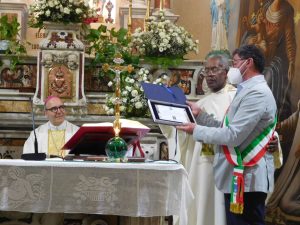 Prima del termine della celebrazione il Sindaco di Ceppaloni Ettore De Blasio insieme all’Amministrazione Comunale, ha donato una targa ricordo a Padre Robert che recita: “Al caro Parroco Don Robert, ringraziandolo per l’impegno profuso nella nostra comunità, auguriamo di proseguire con lo stesso entusiasmo il cammino prezioso e difficile intrapreso 25 anni fa”, nel corso del suo intervento ha dato il benvenuto all’Arcivescovo nella comunità e lo ha ringraziato per la sua presenza segno di vicinanza alla stessa comunità, per il suo impegno, il suo lavoro a favore delle aree interne, martoriate purtroppo da tante difficoltà, la pandemia, la guerra e le sue conseguenze, inoltre ha ringraziato Padre Robert per il suo essere un parroco sempre partecipe con gioia, pace e amore, collaborativo con la sua comunità, sempre accanto agli ultimi, agli umili, agli ammalati aurandogli di proseguire il suo lungo cammino con il Signore e con il popolo di San Giovanni.