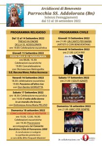 Dopo due anni di stop ritornano i festeggiamenti della Santissima Addolorata al Rione Liberta’ di Benevento. Un ricco programma prsentato questa mattina in una conferenza stampa insieme al comitato festa e all’Accademia delle Opere (Aps).Celebrazioni eucaristiche, preghiere, ma anche musica con artisti locali che saliranno sul palco. Da stasera inizia il triduo in onore dell’Addolorata fino a domenica 18 settembre. All’incontro ha partecipato il parroco Don Gaetano, esponenti del comitato, e il presidente dell’ Accademia delle Opere, Francesco Tuzio, e una rappresentanza di artisti artisti sanniti che si esibiranno.Momenti non solo liturgici ma anche riflessioni sui problemi del rione e della citta’.