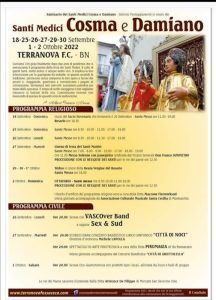 “ Carissimi, scrive Padre Albert presentando il programma, con gioia finalmente dopo due anni di pandemia che vi annunciamo il programma della festa dei Santi Medici. Il culto di questi Santi, molto antico, è sempre vivo, si implora la loro intercessione per la guarigione da malattie, in quanto secondo la tradizione, prestavano senza compenso la loro opera a favore dei poveri e viaggiando guarivano e convertivano i pagani al cristianesimo. Sentiamoci tutti coinvolti, lasciamoci prendere per mano dalla speranza; è tempo di scelte coraggiose e non vogliamo rimanere ai balconi della vita, camminiamo insieme non mancando di puntare lo sguardo sulle realtà eterne. ”
