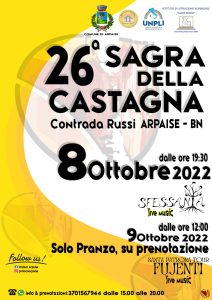 La Pro Loco “Generoso Papa” di Arpaise con il patrocinio del Comune di Arpaise, dell’UNPLI (Unione Nazionale Pro Loco d’Italia) in collaborazione con l’Istituto di Istruzione Superiore “Aldo Moro” di Montesarchio, organizza la 26esima Edizione della Sagra della Castagna il prossimo Sabato 8 Ottobre dalle ore 19.30, mentre Domenica 9 Ottobre dalle ore 12.00 solo a pranzo su prenotazione.
