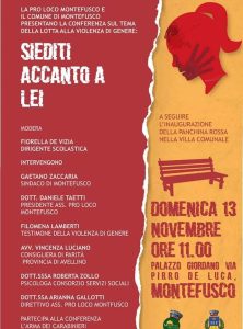 Domenica 13 novembre alle ore 11.00 presso Palazzo Giordano a Montefusco, si terrà un incontro dal titolo “Siediti accanto a lei” per riflettere sul grave fenomeno della violenza di genere. L’appuntamento è organizzato dalla Pro Loco e dal Comune di Montefusco e vedrà la partecipazione del sindaco Gaetano Zaccaria, del Presidente della Pro Loco, Daniele Taetti, la preziosa partecipazione di Filomena Lamberti, testimone di violenza di genere, Vincenza Luciano, consigliera di Parità della Provincia di Avellino, Rosetta Zollo, psicologa, Arianna Gallotti, del direttivo Associazione Pro Loco Montefusco. Presenzierà l’Arma dei Carabinieri, mentre la conferenza sarà moderata dalla Dirigente Scolastica, Fiorella De Vizia.