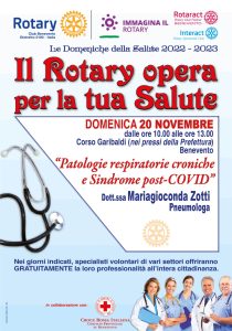 Domenica 20 novembre, dalle ore 10.00 alle ore 13.00, vicino ai giardini della Prefettura, lungo Corso Garibaldi, torna l’appuntamento con le Domeniche della Salute, organizzate dal Rotary Club di Benevento, quest’anno presieduto dalla Professoressa Rossella Del Prete, in sinergia con la Croce Rossa Italiana, che mette a disposizione dei volontari medici rotariani e non solo, un camper per le visite specialistiche.