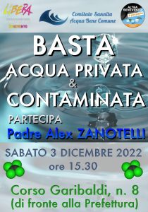 Il Comitato Sannita Acqua Bene Comune, AltraBenevento e Libera invitano tutti i cittadini a manifestare pacificamente sabato 03.12.2022 per dire basta alla privatizzazione e alla contaminazione dell’acqua. È arrivato il momento di chiudere i pozzi contaminati al tetrocloroetilene e tutelare la salute delle persone. Sono trascorsi oltre 4 anni dalla prima denuncia di Altrabenevento sulla presenza del pericoloso contaminante nelle falde, dopo che l’amministrazione comunale ne aveva addirittura negato la presenza. La situazione è gravissima perché parliamo dell’acqua bevuta dalla maggioranza dei cittadini beneventani ed ancora non si è compreso da dove arrivano gli sversamenti in assenza del piano di caratterizzazione. Questa vicenda è la plastica dimostrazione che l’acqua non può essere gestita dalle multinazionali. La presenza di picchi di tetracloroetilene, di gran lunga superiore alla soglia prevista dalla legge, non può più essere tollerata ed è certificata dalle analisi dell’Arpac, alle quali la Gesesa contrappone le proprie campionature fatte dal fontanino di Pezza Piana. La Spa non dice, però, che dal fontanino esce acqua miscelata con quella del Biferno, mentre le analisi dell’ASL si riferiscono ai prelievi fatti direttamente nei pozzi.
