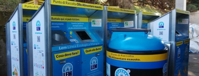 Le nuove colonnine, installate dalla ditta Lem Line Ecologica Mangia, sono dotate di doppia camera per consentire di conferire l’olio sia direttamente nella struttura che di cestinare la bottiglia sigillata.