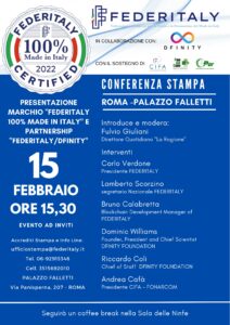 Il 15 febbraio, alle ore 15.30, si svolge la Conferenza Stampa di presentazione del marchio “Federitaly 100% made in Italy” e l’annuncio della partnership della Federazione del Made in Italy con la Fondazione Dfinity. La conferenza stampa, che si svolgerà presso Palazzo Falletti in Via Panisperna 207, a Roma, sarà moderata dal Direttore del quotidiano “La Ragione”, Fulvio Giuliani.