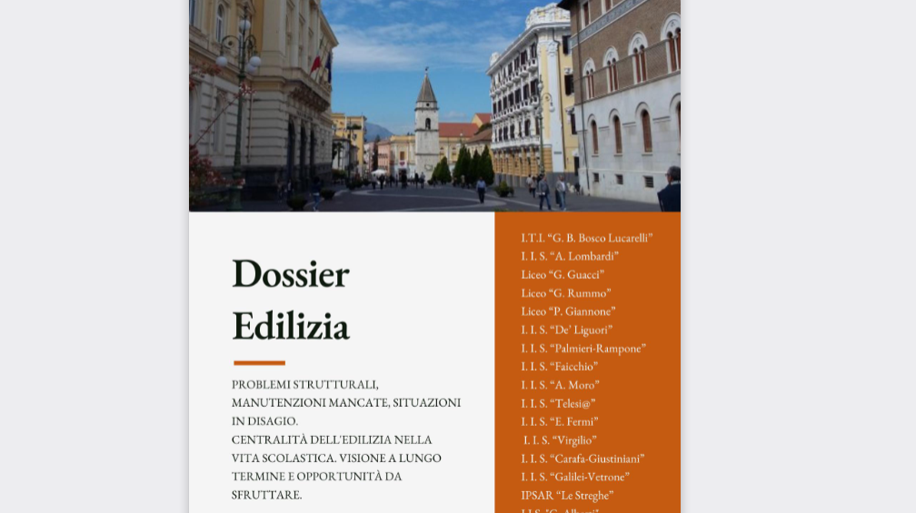 Durante l’ultima assemblea plenaria, tenutasi al Liceo Classico “P. Giannone” il 23 gennaio, la Consulta Provinciale degli Studenti di Benevento ha approvato la versione definitiva del “Dossier Edilizia”: si tratta di un documento realizzato per iniziativa dei Rappresentanti della CPS con la finalità di evidenziare i problemi strutturali degli edifici scolastici ed i conseguenti pericoli e disagi a cui sono esposti quotidianamente gli studenti e le studentesse della provincia.