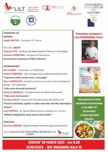 Sempre nell’ambito delle iniziative dedicate alla SNPO, la Lilt di Benevento (con il patrocinio della Lilt di Caserta) ha organizzato un convegno sulla prevenzione oncologica: in programma per giovedì 30 Marzo, alle ore 9.00, presso il Dipartimento di Scienze e Tecnologie Unisannio (Aula 10). La tavola rotonda (moderata da Angela Maffeo, presidente Lilt Caserta) si aprirà con i saluti di: Pasquale Vito, Direttore del Dipartimento di Scienze e Tecnologie Unisannio e del presidente della Lilt di Benevento, Salvatore Francione insieme ad una delegazione dell’Associazione studentesca CUSAS Unisannio. Seguiranno gli interventi di: Oto Cusano, coordinatore Lilt Campania; Antonio Febbraro, UOC Oncologia Osp.le Fatebenefratelli Benevento (che relazionerà sull’ “Importanza della prevenzione in oncologia”); Associazione Provinciale di Benevento Ettore Varricchio, Presidente del Corso di Laurea in Scienze Biologiche e Biologia, DST Unisannio (con la tesi: “L’olio come alimento funzionale”) e Giovanni Ianniello, presidente Ordine Medici di Benevento che parlerà dell’ “Olio come nutraceutico”. Subito dopo, sarà la volta di: Salvatore Fico, responsabile Controllo qualità Olio Dante S.p.a. (“Processo estrattivo, qualità ed analisi sensoriale dell’olio extravergine di oliva”) e di Luigi Coppola, Dir.Medico IPASD nutrizione e Dietetica A.O. San Pio (“Malattia Neoplastica: quale piano nutrizionale”). Le conclusioni saranno affidate al Magnifico Rettore Università degli Studi del Sannio, Gerardo Canfora.