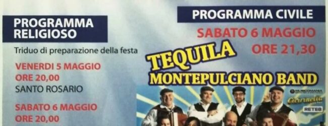 Il sipario sul programma civile si alzerà sabato 6 maggio con l’attesissimo spettacolo musicale dei ‘Tequila e Montepulciano band’. Sarà un viaggio musicale attraverso il meglio della canzone popolare italiana con esecuzioni fresche ed originali grazie ad arrangiamenti molto curati. La band esprimerà una vitalità ed un’energia senza pari; la nutrita formazione della band ha alle spalle grandi successi discografici e un’attività live con centinaia di concerti l’anno. E nella piazza di Torrepalazzo la band proporrà sicuramente la mitica ‘Cicirenella Teneva Teneva’ e tante altre… Quindi sabato sera alla contrada Torrepalazzo di Torrecuso il divertimento è assicurato. Domenica 7 maggio invece si balla liscio e balli di gruppo con il grande ‘Rochitos’ e la sua band.
