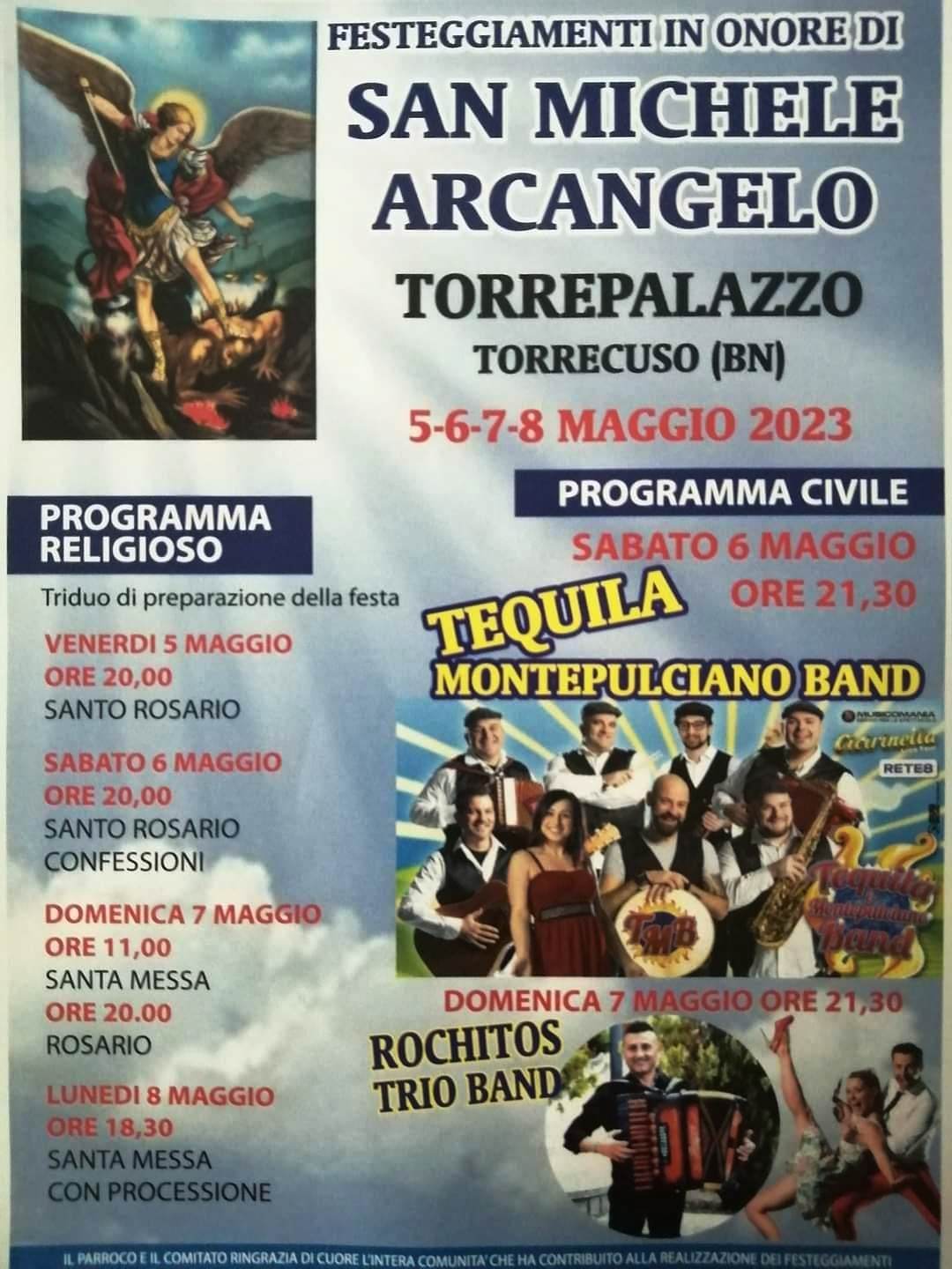 Tutto pronto per i solenni festeggiamenti in onore di San Michele Arcangelo, patrono della contrada Torrepalazzo di Torrecuso che fa parte della parrocchia ‘Spirito Santo’ di Pezzapiana dove è parroco don Maurizio Sperandeo. Questa festa è di consolidata tradizione ed è dedicata appunto all’apparizione sul Gargano di San Michele Arcangelo.