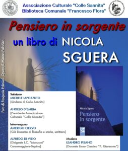 Domani, 20 maggio alle ore 17.30 presso la Sala Consiliare del Municipio di Colle Sannita sarà presentato il libro di Nicola Sguera (che qui, come ricorda spesso, iniziò la sua carriera di docente nella scuola statale, conservandone sempre uno splendido ricordo), “Pensiero in sorgente” (Delta 3 Edizioni), che raccoglie brevi riflessioni, saggi, articoli prodotti negli anni Dieci del nuovo secolo, scanditi in quattro sezioni, seguite da scritti autobiografici e una raccolta di aforismi.
