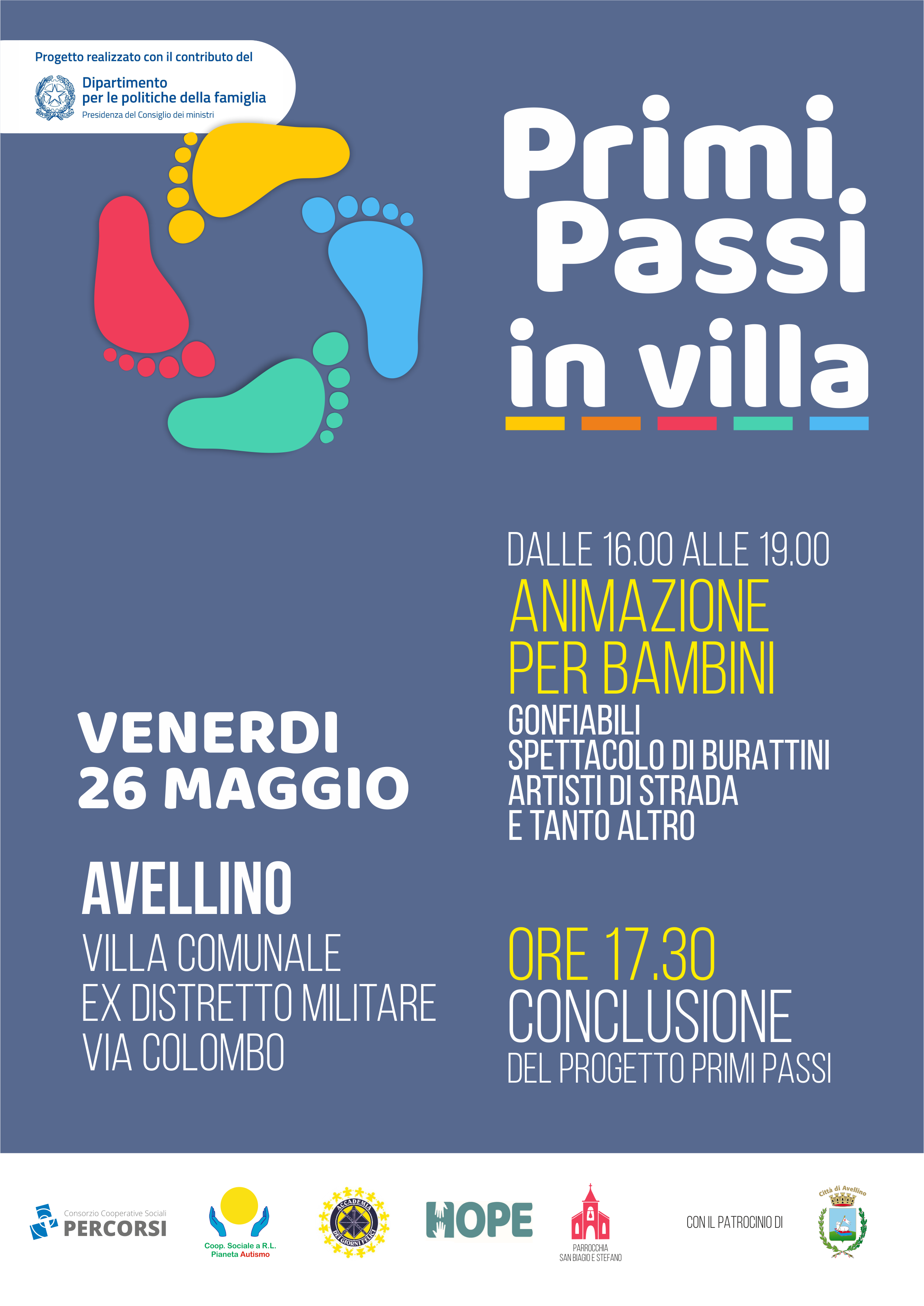 Si terrà venerdi 26 maggio 2023 ad Avellino presso la Villa Comunale di Via Colombo la festa di chiusura del progetto progetto Primi Passi realizzato con il contributo del Dipartimento per le politiche della famiglia della Presidenza del Consiglio dei Ministri.