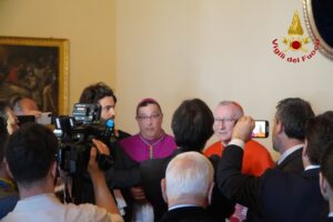 Il saluto di Parolin tocca anche il conflitto bellico in Ucraina: “Le mie preghiere e quelle di Papa Francesco – ha detto – sono indirizzate al desiderio di appianare le diversità. Il miracolo dello Spirito Santo è creare diversità ma anche di armonizzarle, come fonte di ricchezza e non di conflitto. La preghiera e lo Spirito Santo potranno, nell’amore, convertire i cuori”. E sull’accoglienza ricevuta: “Dare le chiavi può essere pericoloso, significa che posso entrare in qualsiasi momento. Ma qui so che sarò sempre ben accolto”.