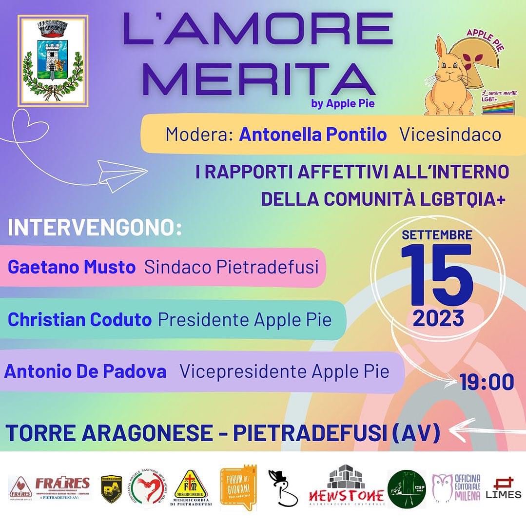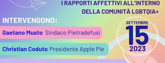 Ricominciano gli incontri promossi dall’associazione LGBT+ “Apple Pie”, organizzati con l’obiettivo di favorire la cultura del rispetto sull’intero territorio irpino, abbattendo, attraverso la conoscenza, il muro dell’omofobia. Il nuovo appuntamento, infatti, è fissato per domani, venerdì 15 settembre, alle ore 19:00, nel suggestivo contesto della Torre aragonese di Pietradefusi.