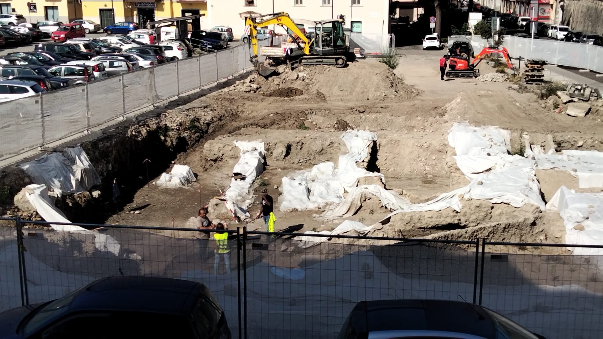 Da uno sguardo dall’alto la novità che emerge è che le ditte chiamate al lavoro sono quattro; le due prettamente archeologiche, quella Nardone e un’altra per conto di Gesesa per mettere riparo ad una precedente criticità riguardo ad un sottoservizio idrico. Gabriele Corona, leader di Altrabenevento e attivo più che mai su questo versante, così come in altri, coglie il senso della novità e si chiede il motivo per cui gli archeologi scavino non già nel punto in cui dovrà sorgere l’infopoint bensì in un luogo diverso del cantiere.