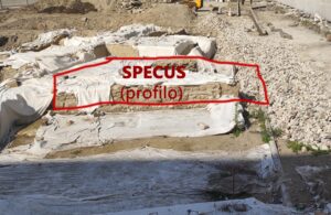 Infatti il pietrame utilizzato per la nuova massicciata stradale poggia e ha coperto parte del setto murario della copertura a volta e dei blocchi litici dello specus. La struttura è così descritta nella relazione archeologica “una condotta – presumibilmente per il deflusso delle acque – o meglio uno specus in grandi blocchi litici (rifunzionalizzazione dei basoli di un tracciato di epoca romana?) rivestito da una malta mescolata a cocci finemente tritati. La sezione si presenta con volta ad arco, due setti murari paralleli ed una depressione a “V” interna. La presenza della struttura funzionale al deflusso delle acque, potrebbe confermare l’ipotesi precedentemente denunciata, ovvero che gli elevati presenti nel settore B siano di pertinenza delle terme”.