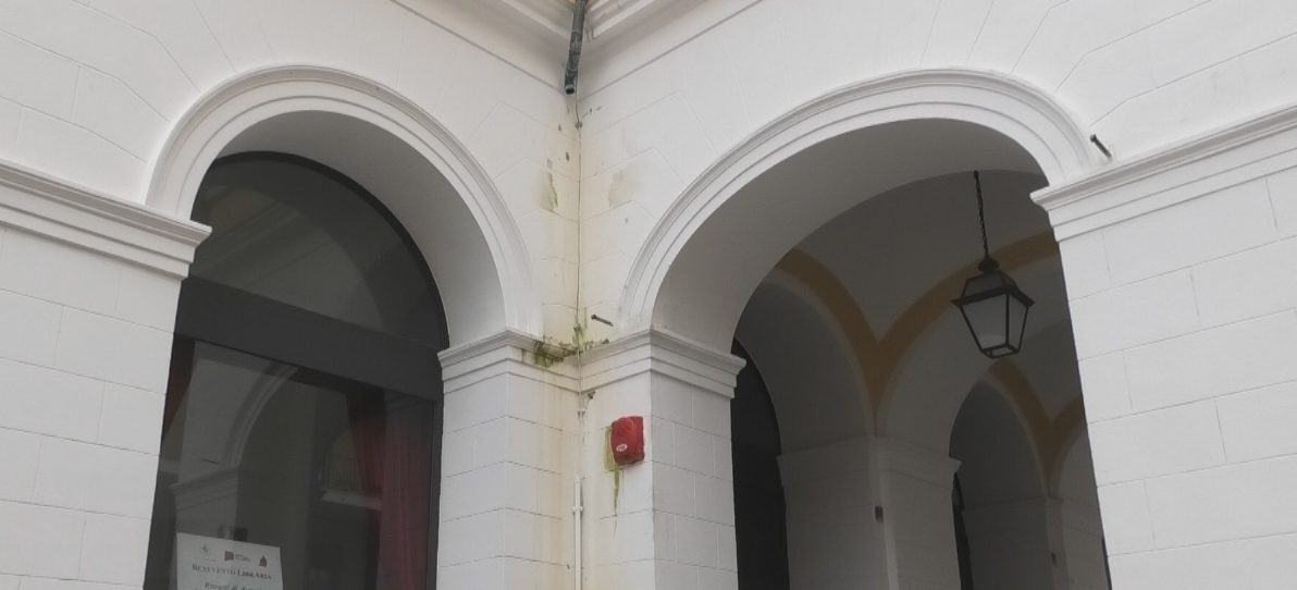 Finalino sui tubi di scarico dell’acqua del Teatro Comunale. In due punti risultano ancora incompiuti, in uno in particolare l’acqua piovana ha già colorato di verde la parete da poco imbiancata. E qui non si tratta vandalismi, come nel caso delle panchine martoriate di Piazza Roma, ma di incuria per una struttura da poco tornata alla città, con pieno merito da parte dell’Amministrazione comunale.