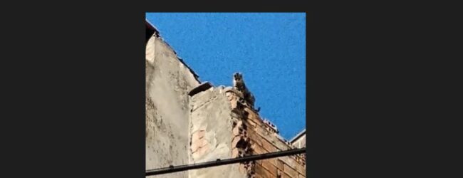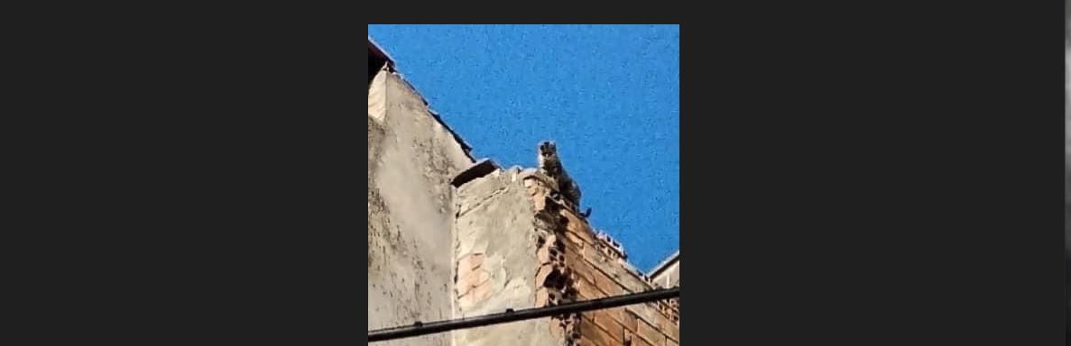 Il tetto fatiscente e pericolane dell’edificio, però, non permette il facile intervento del 115 che, dopo svariate peripezie, riesce ad accedere al sottotetto dello stabile e lasciare lì acqua e cibo per il povero animale. La situazione però non si rivolve, il gatto continua a piangere disperato e non riesce a tornare “a terra” (lo strapiombo è di circa 30 metri).