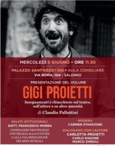 Mercoledì 5 giugno p.v. alle ore 11,30, nell’aula consiliare di palazzo Sant’Agostino a Salerno, si tiene la prima presentazione in Campania del libro “Gigi Proietti. Insegnamenti e chiacchiere sul teatro, sull’attore e su altre amenità”, scritto da Claudio Pallottini, autore, sceneggiatore, attore e collaboratore storico del maestro Proietti. L’opera è stata pubblicata da Carocci editore (ottobre, 2023) con il contributo della Fondazione Gigi Proietti e Casa Shakespeare.