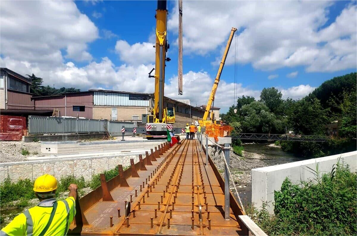 La trave in acciaio corten, posizionata da maestose grù, pesa quasi 40 tonnellate. L’intervento ha riguardato anche il rifacimento dell’alveo, scavato per abbassare il livello del corso d’acqua, con la nuova palificazione degli argini e la messa in sicurezza.