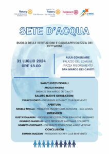 Organizzato dai Club Rotary di  Benevento e di Morcone – San Marco e dal Rotaract di Benevento, mercoledì 31 luglio si terrà l’evento dal titolo: “SETE D’ACQUA Ruolo delle Istituzioni e consapevolezza dei cittadini”. L’appuntamento è fissato alle ore 18.00 presso l’aula consiliare del Comune di San Marco dei Cavoti.