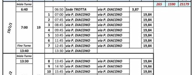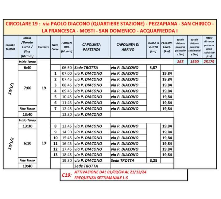 La linea 19 circolare (Pezzapiana-San Chirico-La Francesca-Mosti-San Domenico-Acquafredda-Ripamorta con capolinea sempre in via Diacono) avrà 8 corse nella fascia mattutina 7:00/14:00 da lunedì al sabato e 5 corse nella fascia pomeridiana dalle 14:00/19:30 da lunedì al sabato.