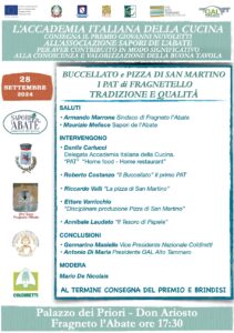 Un convegno sulle “Eccellenze fragnetellesi” è in programma il prossimo 28 settembre, alle 17,30 presso Palazzo dei Priori – Don Ariosto, nel centro storico di Fragneto l’Abate. Il piccolo borgo alle porte del Fortore è noto per alcune produzioni uniche nel panorama provinciale: il Buccellato, dolce o salato, una duplice specialità pasquale le cui origini sono talmente antiche da perdersi nella memoria delle stesse genti che da secoli lo preparano, e la Pizza di San Martino, che tradizionalmente era preparata dai fattori l’11 novembre, in occasione della festa del santo, e donata ai proprietari dei fondi.