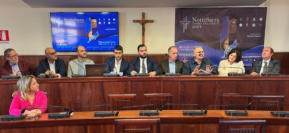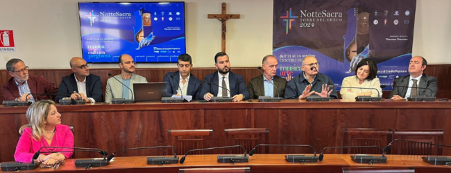 Questa mattina, nel Palazzo Baronale del Comune di Torre del Greco la conferenza stampa di presentazione di Notte Sacra 2024, con i saluti dell’On. Loredana Raia, Vicepresidente Consiglio Regione Campania, dell’Avv. Luigi Mennella, Sindaco di Torre del Greco e dell’Avv. Michele Polese, Vicesindaco di Torre del Greco e di Don Giosuè Lombardo, parroco della Basilica di Santa Croce.