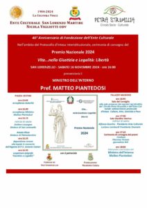 Sabato 16 novembre a San Lorenzello (BN) una giornata dedicata alla memoria e alla legalità, alla presenza del Ministro dell’Interno – Pref.Matteo Piantedosi: alle ore 16.25 ci sarà la Deposizione della corona di alloro alla lapide in memoria dell’Agente di Polizia di Stato Antonio Cestari e alle ore 16.35 lo Svelamento dell’epigrafe “ Giustizia e legalita’ “.