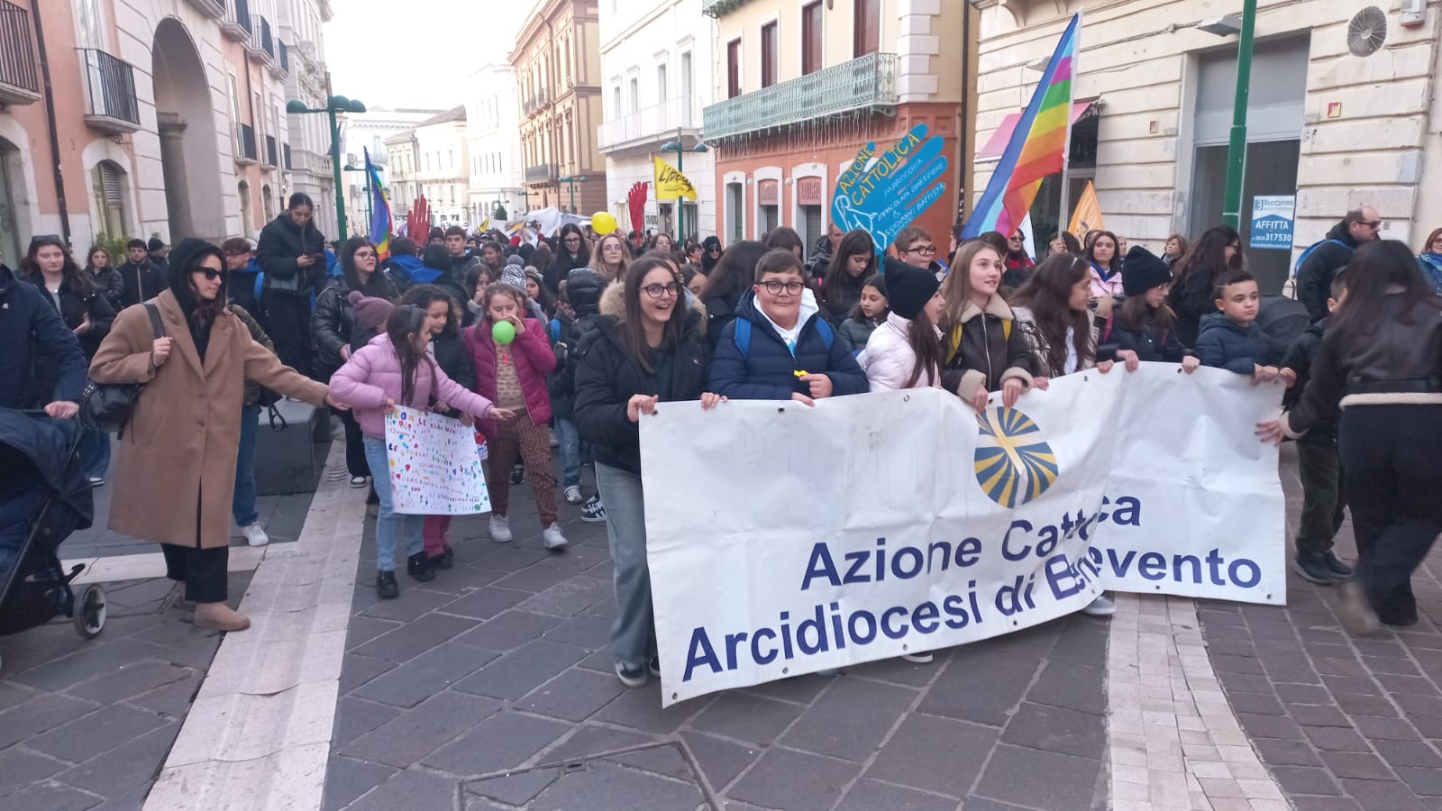 “La Pace non è mai un traguardo acquisito, ma un percorso che richiede lo sforzo di ciascuno. Costruire la Pace è un’azione quotidiana, un impegno costante che ognuno può mettere in pratica, ponendo attenzione al riconoscimento della dignità di ogni persona”. Con queste parole ha avuto inizio questo pomeriggio la Marcia della pace a Benevento organizzata dall’Azione Cattolica diocesana. Presenti tra i giovani l’arcivescovo Accrocca e l’assessore alla Cultura del Comune Tartaglia Polcini.